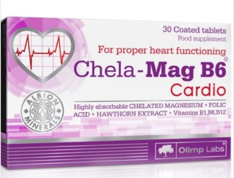 Olimp Chela-Mag B6 ® Cardio - это пищевая добавка в форме удобных для глотания таблеток, содержащая ингредиенты, поддерживающие работу сердца и системы кровообращения. Препарат дополняет рацион магнием в форме хорошо усваиваемого, аминокислотного хелата Albion ™, нежно воздействующего на желудочно-кишечный тракт. Кроме того, в состав Olimp Chela-Mag B6 ® Cardio входит экстракт боярышника и витамины группы B (В1 (тиамин), B6, B12 и В9 (фолиевая кислота)). Магний - ценный элемент для организма, который помогает в правильном функционировании мышц, в том числе сердечной. Он также положительно влияет на правильное функционирование нервной системы, поддерживает правильный энергетический обмен и помогает уменьшить чувство усталости и утомления. Витамины группы B играют важную роль в производстве энергии, которая необходима для правильной работы сердца, участвуют в производстве красных кровяных телец и поддерживают надлежащий уровень гомоцистеина. Экстракт боярышника улучшает состояние кровеносных сосудов, нормализует уровень холестерина в крови, способствует восстановлению сердечной мышцы и коронарного кровообращения, обладает легким тонизирующим действием.