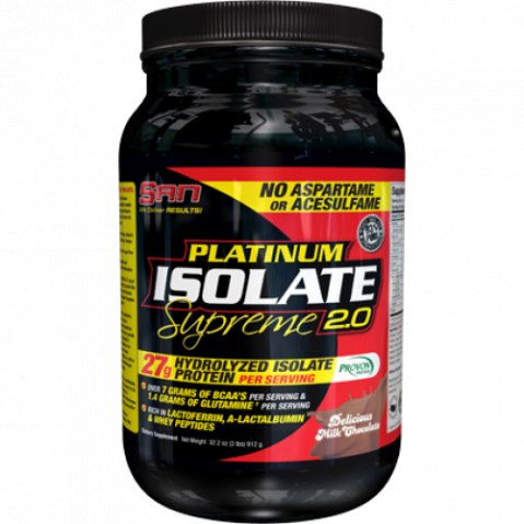 Platinum Isolate Supreme от SAN -27 грамм гидролизованного изолята сывороточного протеина для наращивания мышечной массы в 1 порции -Отличный вкус, формула, которая быстро и полностью смешивается -Не содержит жиров и сахара -Моментальное и полное поглощение -7 грамм аминокислот с разветвленными цепочками (BCAA) и 1.4 грамма глютамина для помощи в наращивании мышечной массы и полного восстановления мышц -Богат лактоферрином, который способствуя росту лакто- и бифидобактерий, улучшает работу кишечника и способствует лучшему поглощению протеинов и увеличению отложения азота -Богат А-лактальбумином, который известен как антиоксидант и вещество, улучшающее когнитивное функционирование -Не содержит Аспартама, Ацесульфама и Лактозы Platinum Isolate Supreme является самым качественным протеиновым коктейлем, который Вы можете найти на рынке. Его формула, которая быстро и полностью смешивается, легко усваивается, а также обладает потрясающим вкусом. Platinum Isolate Supreme содержит: глютамин, аминокислоты с разветвленными цепочками, цистеин, минералы, лактальбумин, лактоферрин и питательные вещества, повышающие уровень глютатионина, который поддерживает иммунную систему. Формула, не содержащая жиров, сахара и лактозы, поставляет 27 грамм матрицы сывороточного изолята Ультра Премиум, включающий в себя сывороточный протеин гидролизат и изолят, который содержит никзко-, средне- и высокомолекулярные пептиды, необходимые для быстрого поглощения и набора сухой мышечной массы.